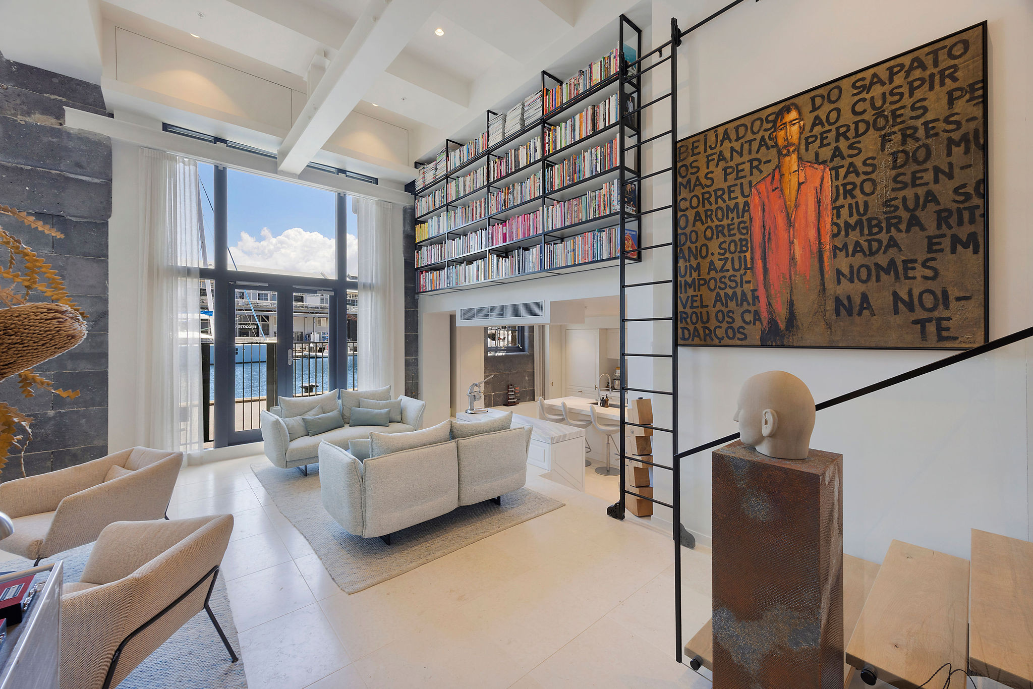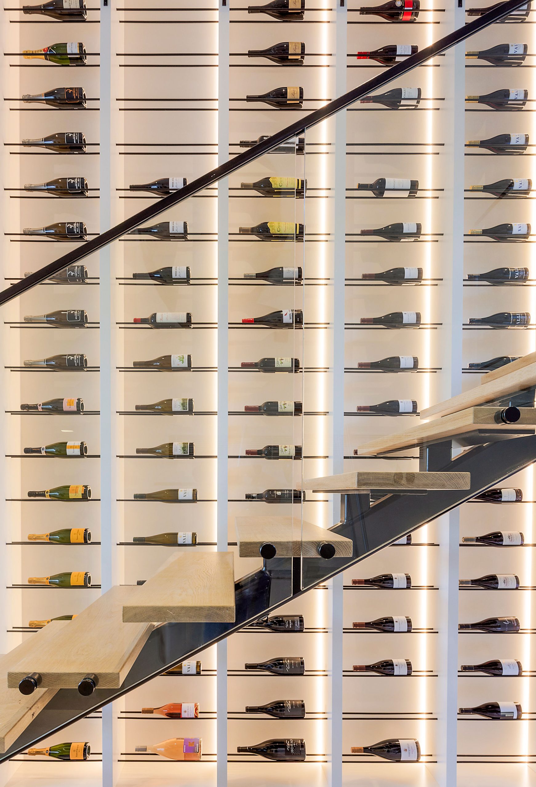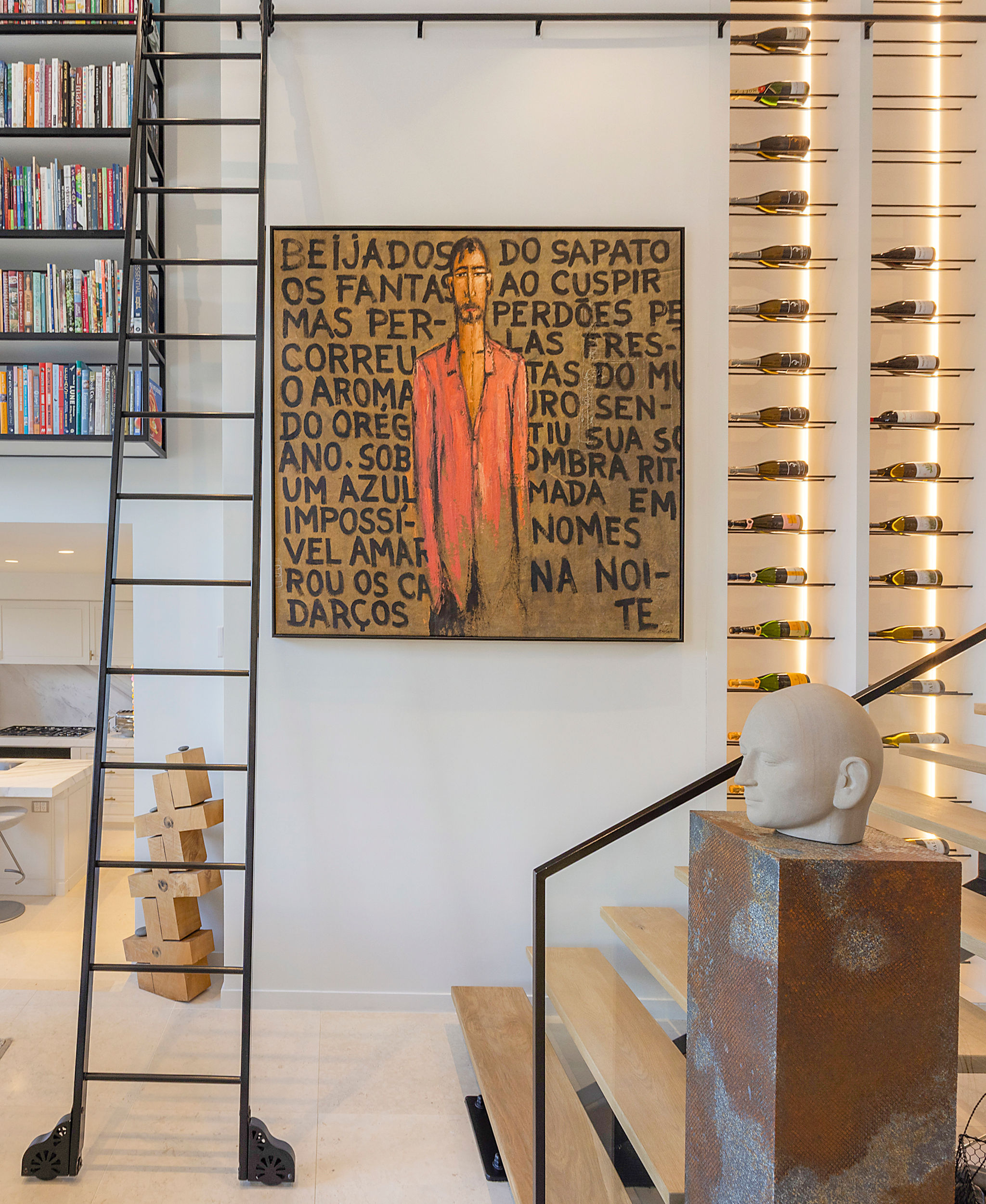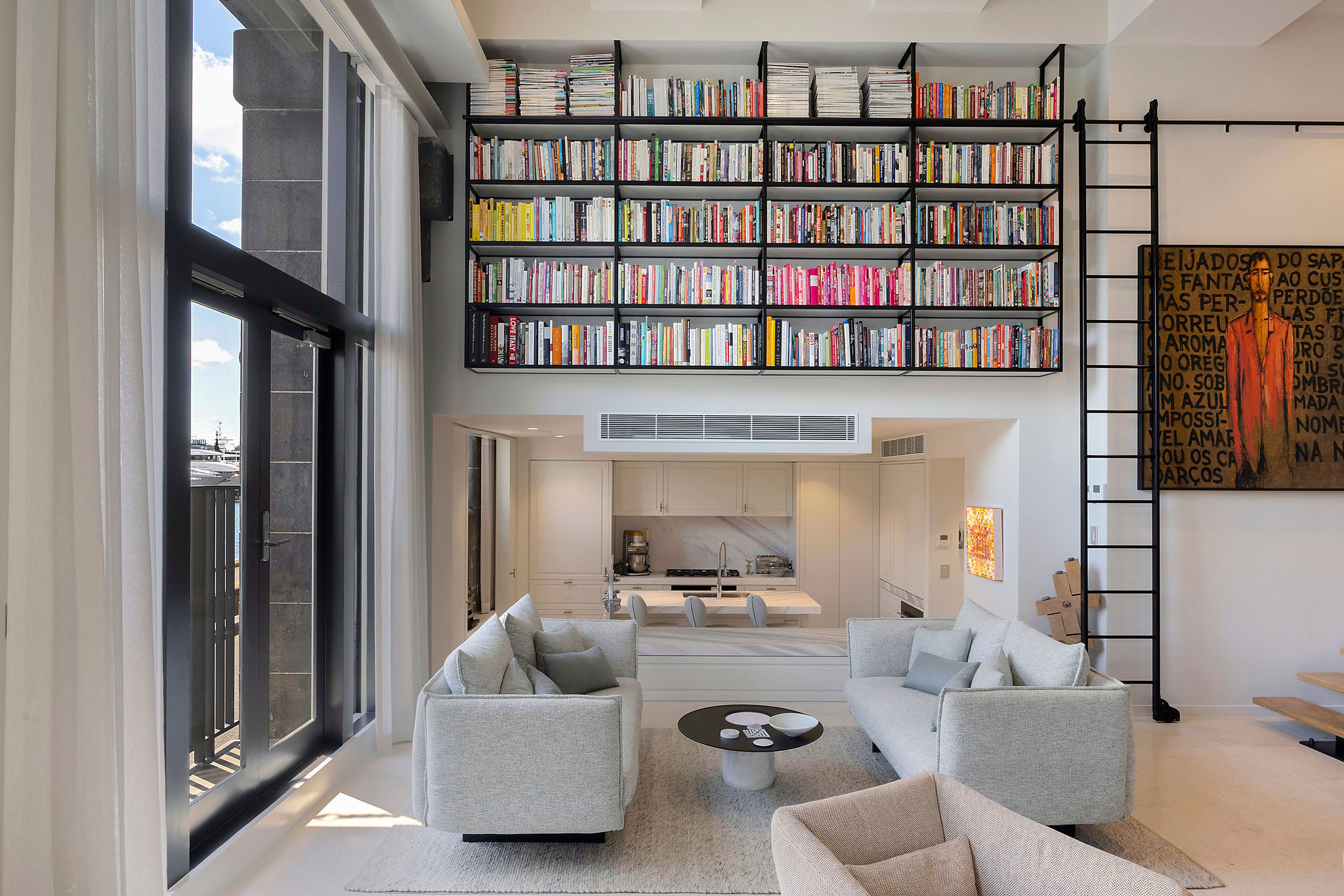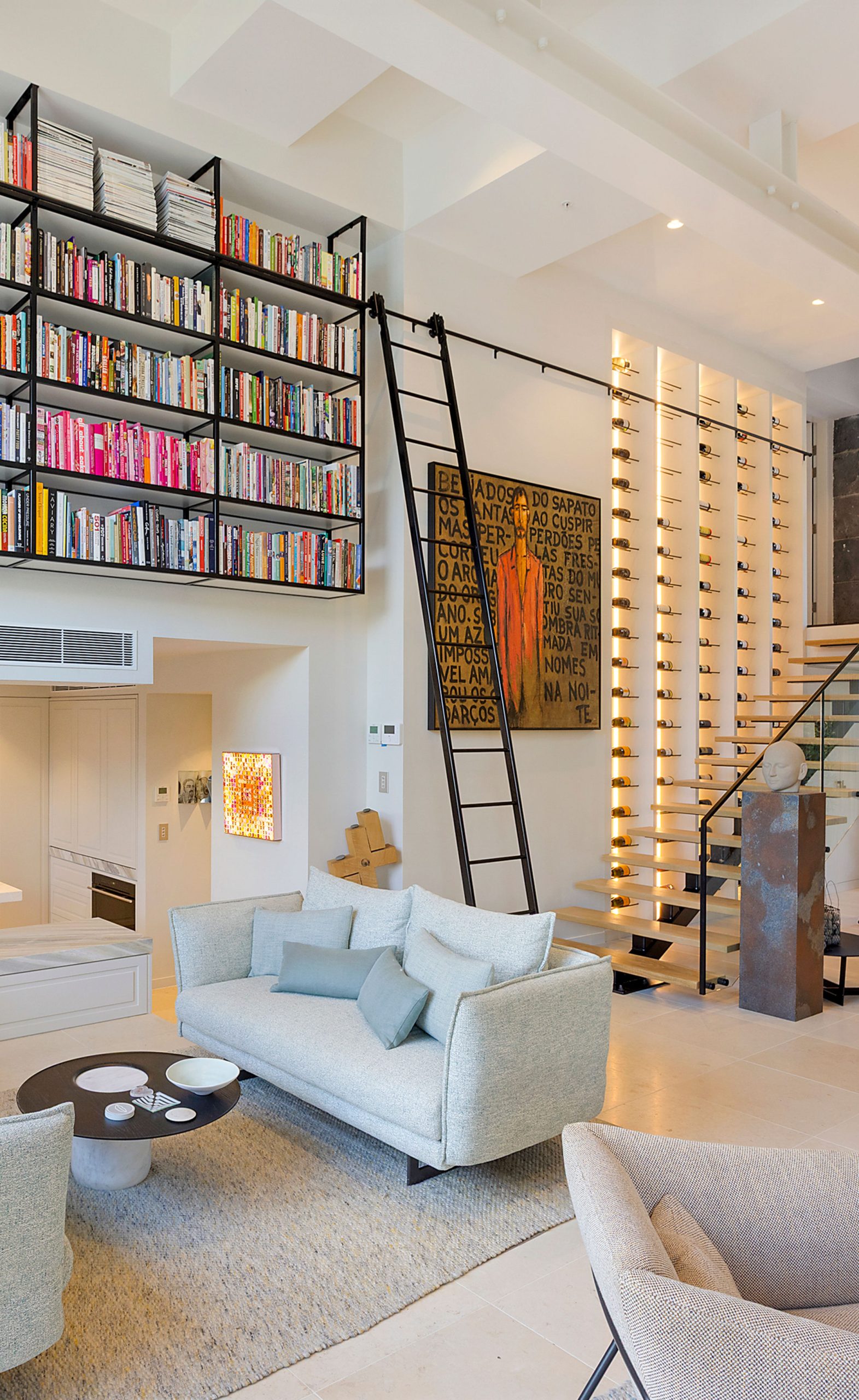 A striking feature of this renovation is the steel and glass wine display—a 3.0m x 4.8m high structure that elevates the apartment’s design. Precision-engineered steel framing supports glass panels, creating a contemporary showcase for the client’s wine collection. The display is accessed by a black powder-coated sliding ladder that glides effortlessly along a matching black powder-coated bookshelf, positioned adjacent to the wine rack. The cohesive detailing between the wine display and bookshelf reflects the project’s architectural consistency and thoughtful material palette.
