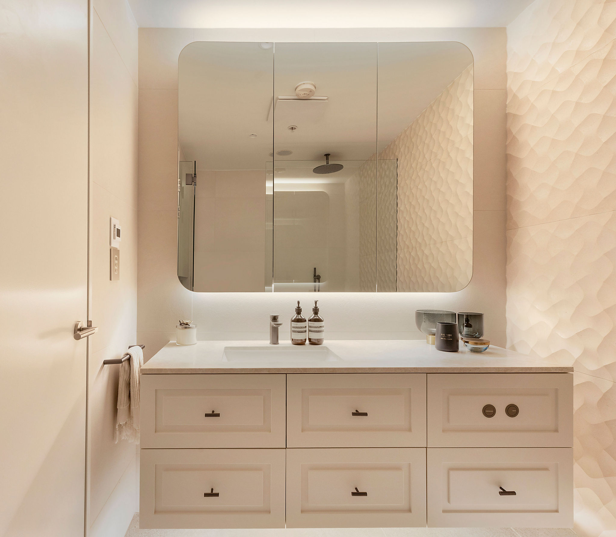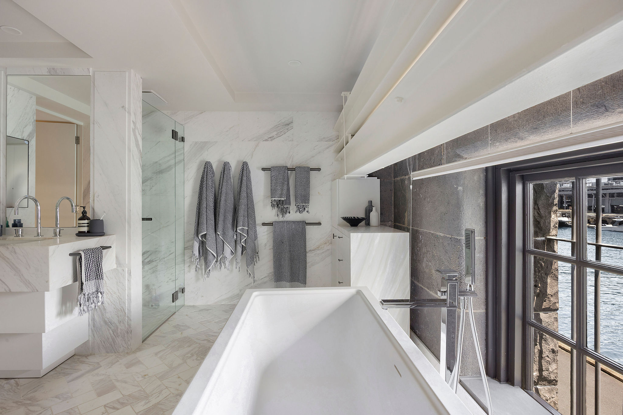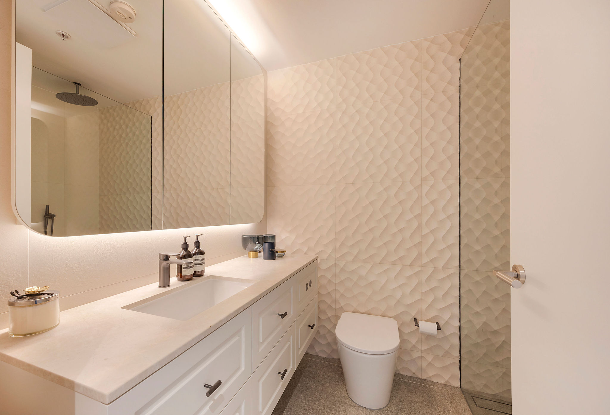 The ground-floor bathroom and ensuite were also fully updated to reflect a refined, modern aesthetic. Large-format tiles, brushed metal tapware, and frameless glass shower screens create a sense of understated luxury. The careful selection of materials ensures that the bathrooms remain timeless while aligning with the apartment’s broader design language.
