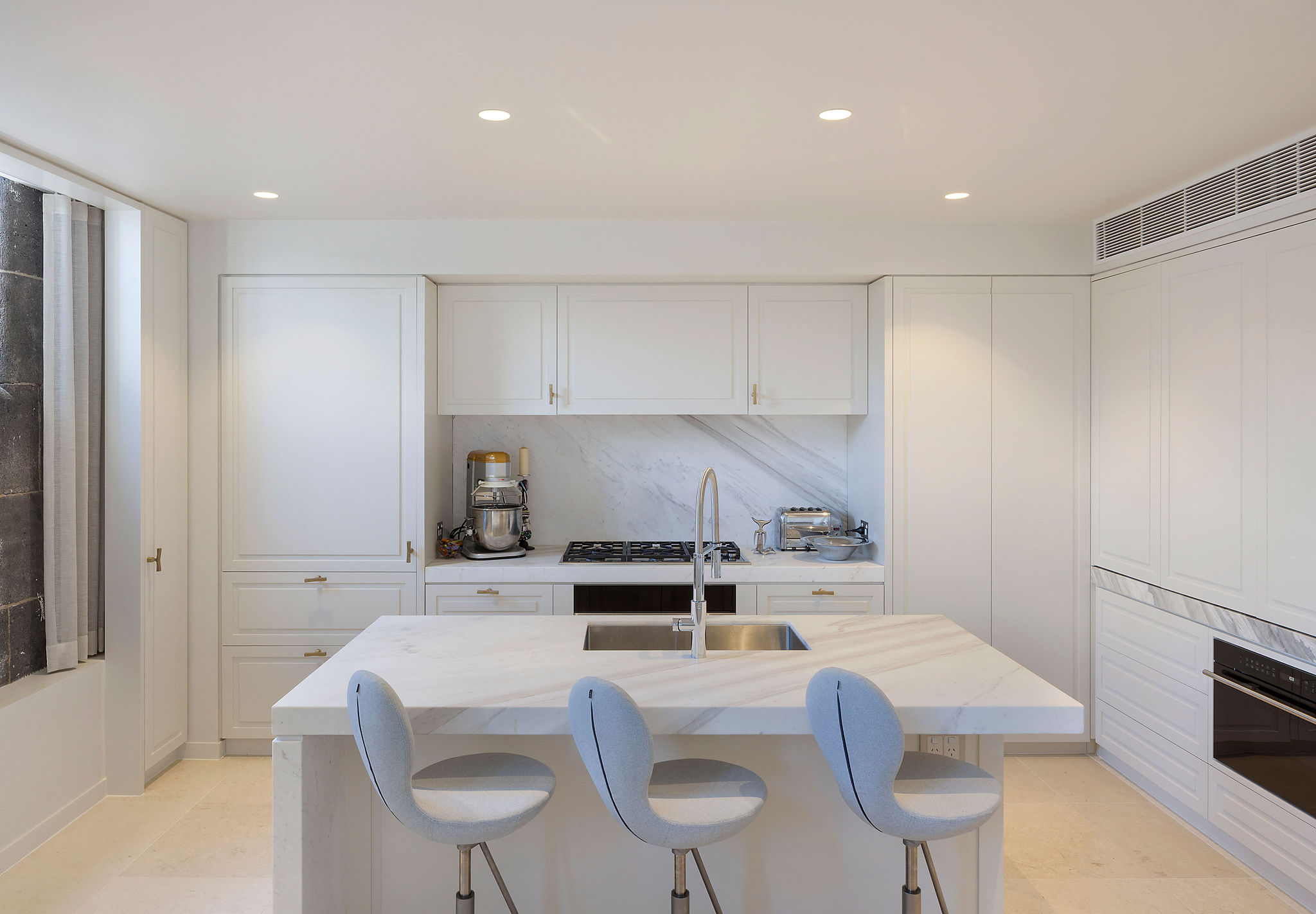 The kitchen was completely redesigned to reflect a contemporary yet timeless aesthetic. Custom joinery in a soft matte finish creates a seamless and elegant look, enhanced by integrated appliances and minimalist detailing. A large island bench, topped with premium stone, provides both a functional workspace and a central gathering point. The cabinetry’s handleless design reinforces the clean lines of the space, while subtle downlighting accentuates the depth and texture of the materials. Thoughtful placement of storage ensures that the kitchen remains as practical as it is stylish.
